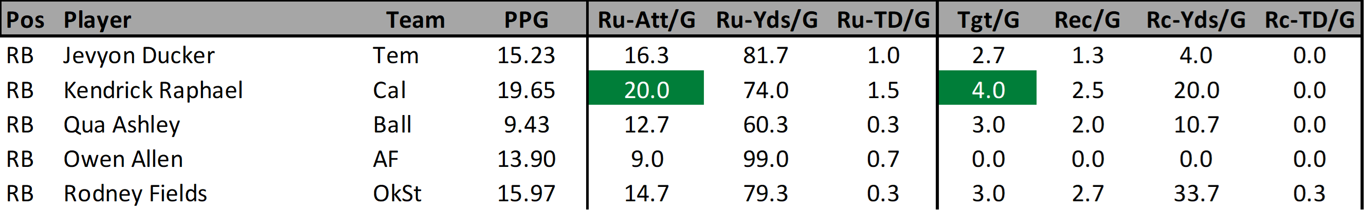 Ducker isn’t a great option but he is a solid one if you need to plug holes in your fantasy line up. He’s scored 14+ fantasy points in all but two of his games this season (one was against Oklahoma). He’s only cracked 20+ fantasy points once but that was also the only game that he was fed at least 20 carries. He makes the top of list list based on his reliability and the fact he has second best schedule of my Top 5 selections.