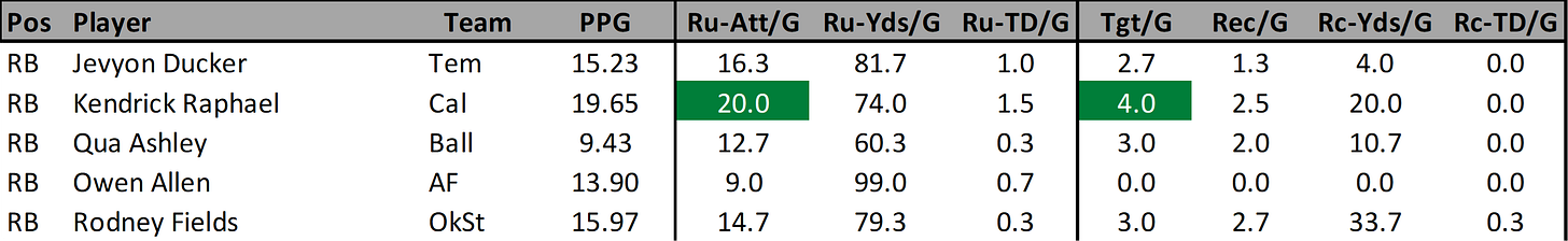 I’m going to be honest here, I don’t have much faith in the Oklahoma State offense. But I have noticed that when Fields gets more than 10 carries in a game he scores at least 17 fantasy points. He’s done that for two weeks in a row now getting 14 and 21 points in route to scoring 17.7 and 26.5 fantasy points in those games. His remaining schedule is average at best but it’s still better than the RBs who made my honorable mention section.