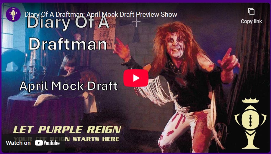 Today the Draftman Diary has been opened to the pages covering the April Mock Draft and Joe Arpasi has decided to use a “Long QB Wait” draft strategy. You can watch the first 10 rounds on the Let Purple Reign: Podcast on YouTube below.