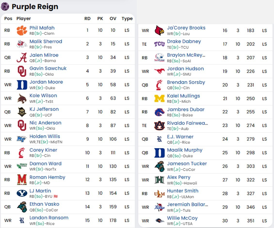 I had WR Xavier Restrepo queued up for the 3rd round but he was sniped one pick in front of me. Since my last draft pick four QBs had gone off the board (6 total) and I decided to make a quick change of strategy. Milroe and KJ Jefferson were the best available QBs on my board and I could have waited to draft one of them in the 4th round but I decided to get greedy and took Milroe here. This upset Jared Palmgren as I sniped his pick right in front of him. There was a small pool of top end Tier 4 RBs that would not make their way back to me in the 5th round so I continued with my RB heavy strategy. Sawchuck was the best Group A player on my board, and Abu Sama was the best Group B player available. Sama provided a better “savior” schedule but Sawchuk plays in a top 25 rushing coaching system so I leaned into the coach’s history over scheduling.
