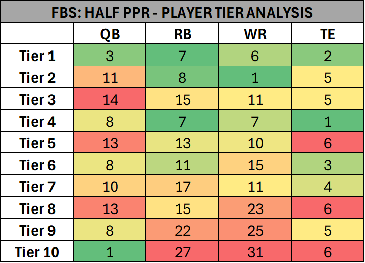 Once I have finished my first round of player rankings I look at how many players from each position group are in each tier. This gives you a feel for how much depth, or lack thereof you can find at different position groups. Green represents rarity while red represents abundance. I’ve only included the top 10 tiers in this breakdown. This information will also help you determine which positions to focus on or wait for during the draft.