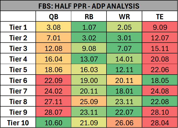 Its extremely important to have an understanding of when players are being taken in drafts. ADP (Average Draft Position) is the tool used to assess this. I’ve pulled the ADP data from the end of June to use for this analysis. I’ve pulled the average ADP for all players within a tier for this review. Since I have players in tiers that are over-valued and under-valued, you will see players drafted earlier and later than these average numbers. The ADP data listed in this article is the average round & draft pick, with 1.01 presenting the first pic of the first round. Green represents the earliest average draft pick for a specific tier, while red represents the latest average draft pick.