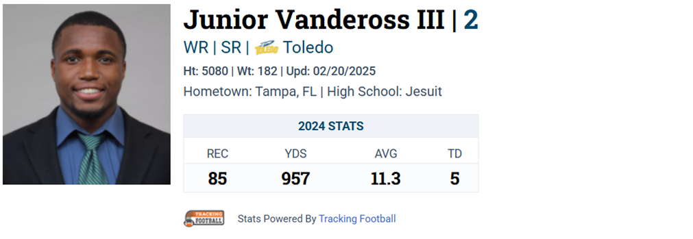 Vandeross was selected as a Riser option for 2025. Quarterback Tucker Gleason returns as the starter in the #13 CFF Coaching System for Dual-Threat quarterbacks. The rushing game received a major upgrade with Kentucky transfer Chip Trayanum. Wide receivers Trayvon Rudolph and Thomas Crosby will provide back-up for Vandeross when attacking opposing secondaries. Since Vandeross was only mentioned one time he doesn’t bring much Schedule Pairing value to the table. Playing in the MAC means that Toledo will have a favorable passing Strength Of Schedule. They received a B- grade for season long, but gets a B+ for the first month and the playoffs.