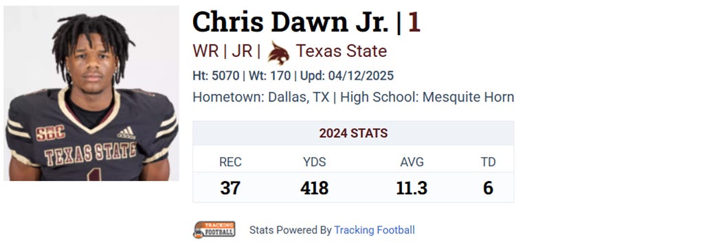 Dawn was highlighted as a Riser option for 2025. Playing in the #19 CFF Coaching System for POWR3 receivers means that Beau Sparks and Tyrin Smith are bound to take pressure off of Dawn. The team is looking to break in a new quarterback that can get these receivers the football. Lincoln Pare and Torrance Burgess will be a handful for defenses to stop in the running game. Dawn is a decent Schedule Pairing option, being featured four times. The best thing about Dawn’s fantasy outlook is the passing Strength Of Schedule. Texas State gets an A- grade for season long and first month, and a B+ grade for the fantasy playoffs.