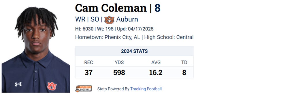 Coleman was selected as a Riser option for 2025. Auburn made the most of this offseason to upgrade the firepower in the passing game. They brought in Jackson Arnold to take over the quarterback position. They also signed receiver Eric Singleton to pair with returning receivers Malcolm Simmons and signed freshman sensation Sam Turner. The ground game has a stable of backs that can all carry the ball with transfer Durrell Robinson, returning backs Damari Alston & Jeremiah Cobb, and true freshman Alvin Henderson. The Auburn passing Strength Of Schedule is adequate, getting a B- for season long, and a B for first month and the payoffs (team does have a bye in Week 12).