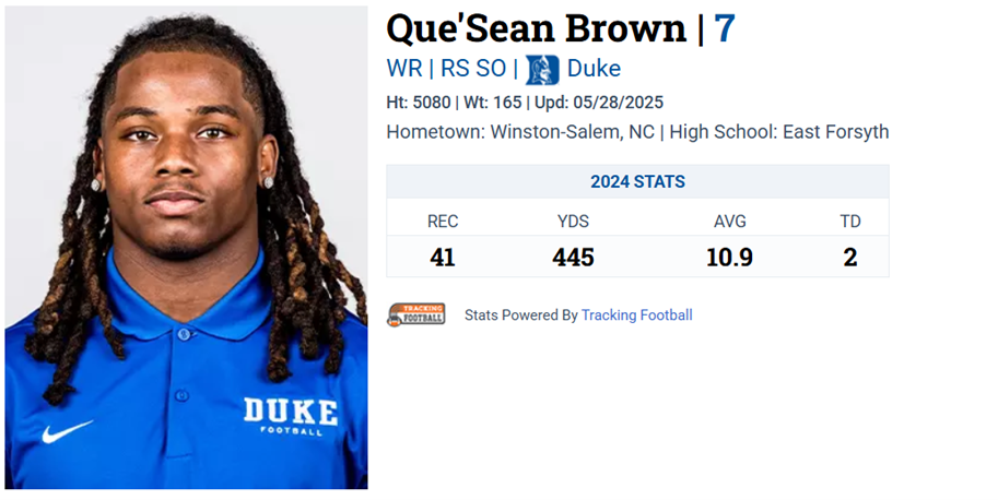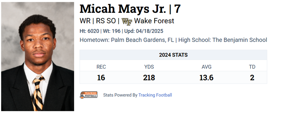 Mays was selected as a Handcuff option for 2025. I believe that all the buzz he got in spring camp is a positive sign that he will emerge as the WR1 in a CFF Coaching System that ranks #13 for Target Magnet wide receivers. The quarterback position is still up for grabs heading into fall camp but the eventual winner will also have Carlos Hernandez, Karate Brenson, and Christopher Barnes to throw the ball to. The star of the Wake Forest offense is running back Demond Claborne who can make the most out of the passing game. Fake Forest will likely be playing from behind for much of the season but their passing Strength Of Schedule is accommodating. They earned a B grade for the first month of the year, a B- for season long, and a B+ for the playoffs.