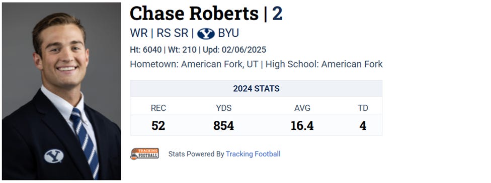 Roberts will be entering his fifth season at BYU this fall. He scored 132 fantasy points in 2024 with 51 receptions for 805 yards and 4 TDs. He’s also received 75 targets in each of the last two seasons. He returns as the WR1 in a BYU offense that features the #38 CFF Coaching System for POWR3 receivers. Jake Retzlaff returns for his second season as the starting quarterback, and also receives support on the ground from third year starting running back LJ Martin. Roberts’ greatest fantasy strength is his Schedule Pairing value, being highlighted six times. The BYU passing Strength Of Schedule features a B grade for season long, A- for first month of the season, and B+ for the fantasy playoffs.