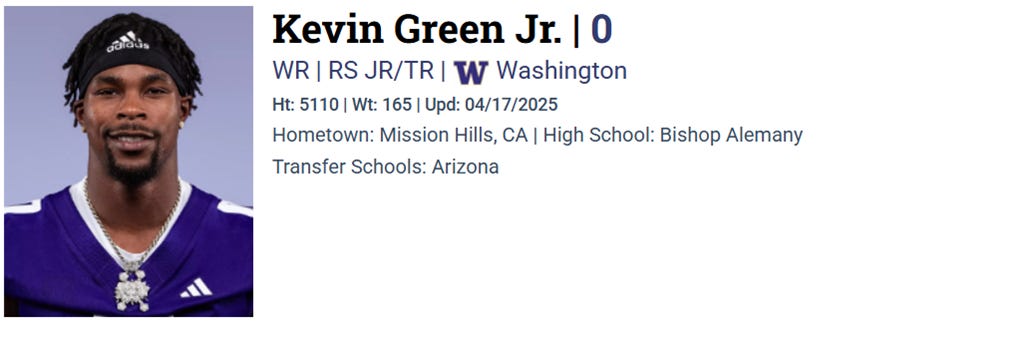 Green was highlighted as a Flyer option for 2025. He joins Denzel Boston, Omar Evans, and Rashid Williams in a CFF Coaching System that ranks #22 for Target Magnet wide receivers, and #13 for POWR3 receivers. The dangerous dual-threat quarterback Demond Williams will enter his first full season as the starting quarterback, and running back Jonah Coleman returns in a CFF Coaching System that ranks #17 for PPR running backs. To cap off the support that Green will have, there is a trio of tight ends in Decker DeGraaf, Quentin Moore, and Ryan Otton. Since Green was only mentioned one time he doesn’t bring much Schedule Pairing value. Washington has a fantastic passing Strength Of Schedule receiving a B+ grade for season long, first month, and the playoffs.