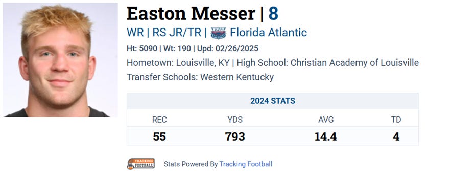 Messer was selected as a Nuclear Option for 2025. The move to Florida Atlantic should be fruitful as this CFF Coaching System ranks #16 for Target Magnet wide receivers and #10 for POWR3 receivers. While being the standout star of this receiver core, he’ll have support from Sean “JR” Wilson and George Johnson. Quarterback Caden Veltkamp takes over at quarterback in a CFF Coaching System that is #8 for Pocket Passer quarterbacks. The Florida Atlantic passing Strength Of Schedule is a little weak though. The first month of the year is the best with a B- grade, but season long is a C+, and the fantasy playoffs only gets a C grade.
