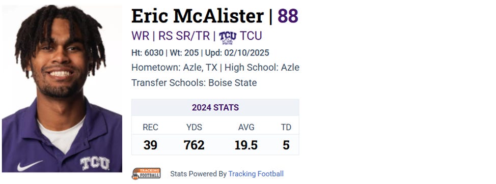 McAlister was featured as a Nuclear Option for 2025. He plays in an offense which has a CFF Coaching System that ranks #14 for Target Magnet wide receivers and #11 for POWR3 receivers. Joseph Manjack, Jordan Dwyer, Major Everhart, and Jordyn Bailey will all be looking to contribute at receiver. There’s even more pass catching support from tight ends Ka’Morreun Pimpton and D’Andre Rogers who are battling for the starting job in the #2 CFF Coaching System for High Volume tight ends. Josh Hoover comes back for his second year as the starting quarterback and the running back position will enter fall camp as an active position battle. The TCU passing Strength Of Schedule comes in with a B grade for season long, B+ for first month, and a B- for the fantasy playoffs.