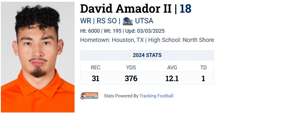 Amador was featured as a Flyer option for 2025. He will be challenged for the WR1 role in the offense by Devin McCuin and both of these players want to take full advantage of the #25 CFF Coaching System for Target Magnet wide receivers. This CFF Coaching System also ranks #10 for Pocket Passer quarterbacks and Owen McCown returns for his second year as the starter. There are a couple of tight end targets in this offense as well with Houston Thomas and Patrick Overmyer. The running back room is stacked with the likes of Robert henry, John Emery, and A’Marion Peterson. Amador brings extra fantasy value to the table, being mentioned five times as a Schedule Pairing option. The UTSA passing Strength Of Schedule gets a B grade for first month and season long, and a B- for the playoffs.