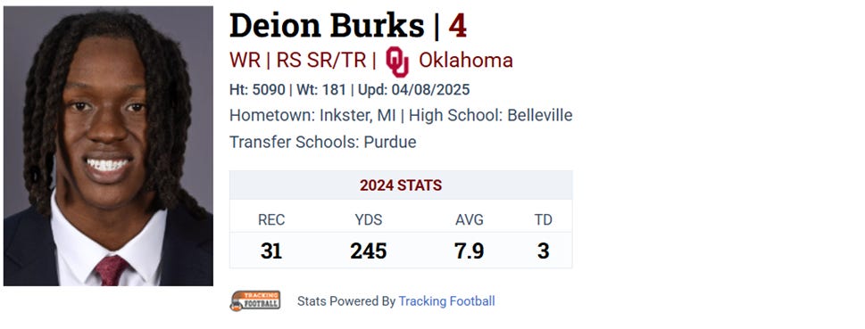 Burks was selected as a Riser option for 2025. Burks will be the benefactor of a CFF Coaching System that is #11 for Target Magnet wide receivers and #8 for POWR3 receivers. There are other receivers that will provide support in Javonnie Gibson, Zion Kearney, Jayden Gibson, and Joshua Martin. Last season’s fantasy QB1 John Mateer transfers into Oklahoma where he is already familiar with this CFF Coaching System that is #3 for Dual-Threat quarterbacks and #2 for Pocket Passer quarterbacks. Last year’s starting running back Jovantae Barnes returns and the team brought in Jayden Ott from California as well. Oklahoma’s passing Strength Of Schedule is it’s Achilles’ heel. They received a B+ grade for the first month of the year, then things drop down to a C+ for season long and the playoffs.
