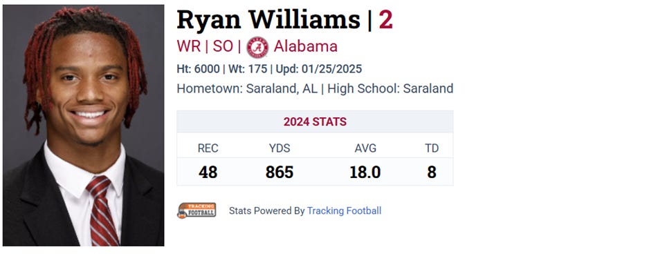 Williams was featured as a Riser option for 2025. Alabama wide receivers are good to have as Alabama’s CFF Coaching System ranks #12 in Target Magnet wide receivers and #12 in POWR3 receivers. Williams gets support from fellow receivers Isaiah Horton, Germie Bernard, and Lotzier Brooks. Ty Simpson will take over under center and will provide the offense a better pocket passer compared to last year. Running back Jam Miller will lead a rushing attack that will force defenses to remain balanced against this Alabama offense. Alabama’s passing Strength Of Schedule stays in the B grade range. They were handed a B- for season long, and a B for first month of the year and the playoffs.