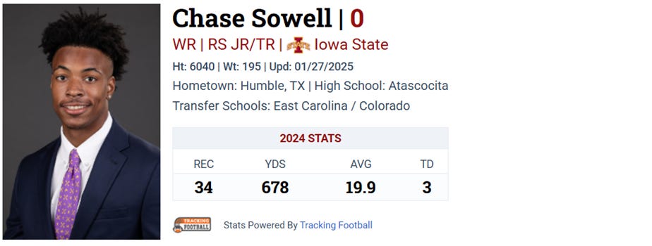 Sowell was highlighted as a Riser option for 2025. The Iowa State offense has been improving their passing game, with this CFF Coaching System now ranking #23 in Target Magnet wide receivers and #30 for POWR3 receivers. Slot receiver Xavier Townsend transfers in from UCF to strength up the receiving core and Rocco Becht returns under center to provide stability at the quarterback position. While this CFF Coaching System ranks #20 in High Volume tight ends, it’s likely that Gabe Burkle and Banjamin Brahmer will split time. The running back position is split too, with Carson Hansen and Abu Sama sharing the workload. The Iowa State passing Strength Of Schedule received a B+ for the first month of the season, and a B for season long and the playoffs (team does have a bye in Week 12).