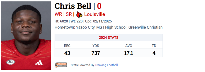 Bell was selected as a Riser option for 2025. As the likely WR1 in the offense I love that this CFF Coaching System is #1 for Target Magnet wide receivers. Receivers Caullin Lacy, Antonio Meeks, and tight end Nate Kurisky provide plenty of pass catching targets for transfer quarterback Miller Moss. Moss will see a bump in his fantasy production now that he’s playing in the #11 CFF Coaching System for pocket passer quarterbacks. The backfield is loaded with returning starter Isaac Brown back and uber talented Duke Watson backing him up. Bell was mentioned six times as a Schedule Pairing option, providing great fantasy value. Louisville’s passing Strength Of Schedule starts great then wanes as the year goes on. They received an A- grade for the first month of the year, a B+ for season long, and a B- for the playoffs.