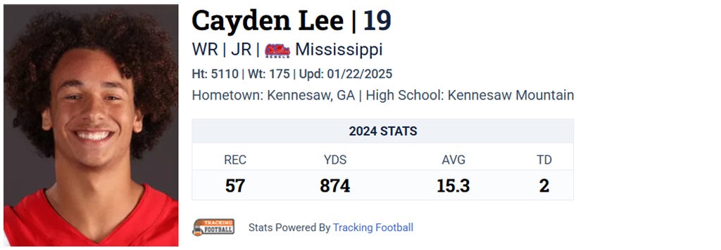 Lee was selected as a Riser option for 2025. Austin Simmons comes into his first season as the signal caller where he and Lee will have a solid supporting cast around them. Oklahoma State transfer De’Zhaun Stribling will make an immediate impact with Harrison Wallace providing depth. This CFF Coaching System ranks #5 for High Volume tight ends despite typically utilizing two guys, where returning starter Daequan Wright and transfer Luke Hasz will be this year’s two-man crew. The running backs are highlighted by Kewan Lacy and Troy transfer Damien Taylor. I’m a huge fan of Lee’s Schedule Pairing value as I highlighted him a whopping eight times. This passing Strength Of Schedule is darn good for an SEC team with a B+ grade for season long, first month, and the playoffs (team does have a bye in Week 13).
