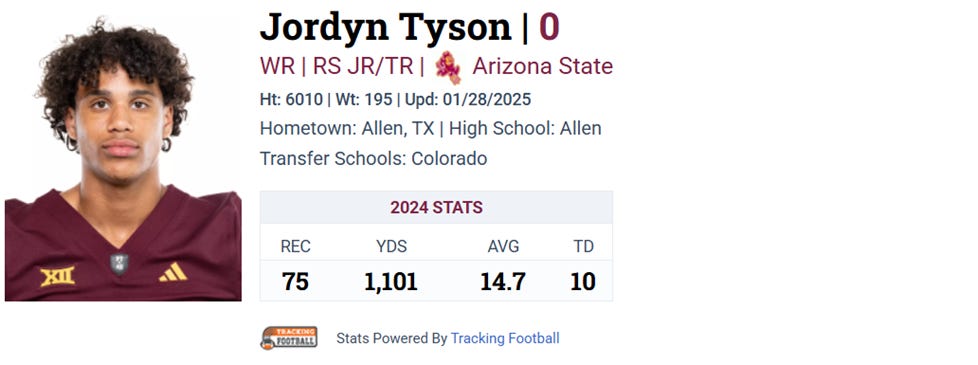 After scoring a total of 83 fantasy points from 2022-2023, Tyson had a breakout 2024 with 203 fantasy points. He was especially hot down the stretch averaging 12.4 targets, 8.8 receptions, 126.2 yards and 1.2 TDs per game over the last five games of the season. He sat out of the playoffs with a collarbone injury but he is fully healthy for 2025. Last year’s starting quarterback Sam Leavitt returns to keep the chemistry going between these two. Receiver Jalen Moss was brought in to provide support alongside returning tight end starter Chamon Metayer. The ground game has two talented rushers this season in Kanye Udoh and Kyson Brown. I love the passing Strength Of Schedule in the Big XII as Arizona State was handed a B+ grade for season long and the playoffs, and an A- for he first month of the season.