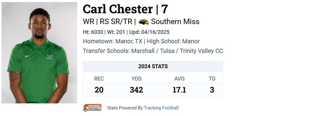 Chester was featured as a Flyer option for 2025. The new Southern Miss passing game features a CFF Coaching System that ranks #7 in Target Magnet wide receivers and #6 in POWR3 receivers. Chester will have help from a deep receiver room highlighted by Micah Davis, Elijah Metcalf, Charles Montgomery, and Tychaun Chapman. Braylon Braxton will be taking over the quarterback position this fall and he will love having such a deep set of receivers to throw to. The running back position is still up for grabs going into fall camp. The weakest part of Chester’s resume is his passing Strength Of Schedule. Southern Miss received a C+ grade for season long, first month, and the playoffs.