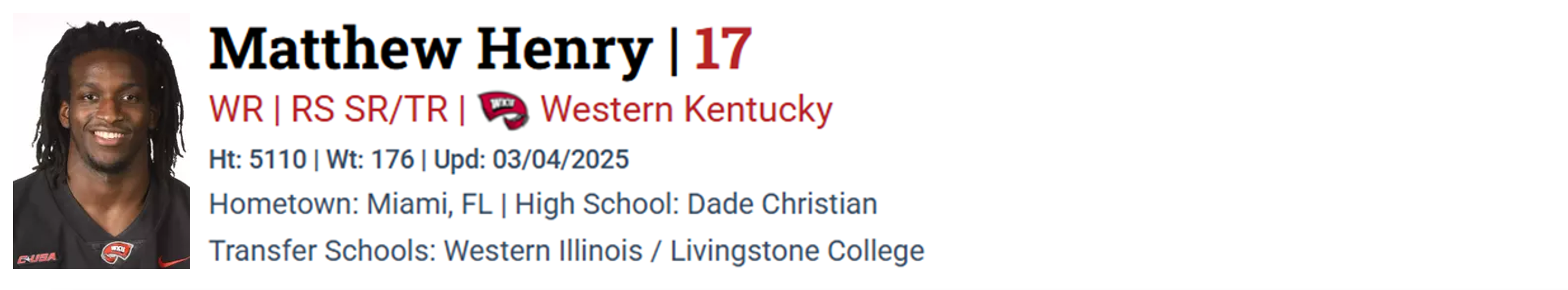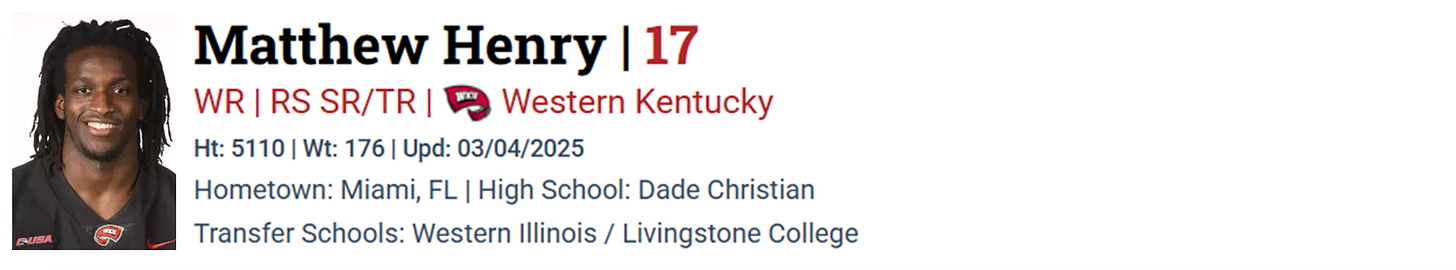 Henry was selected as a Flyer option for 2025. The Western Kentucky passing game is always worth investing in as the CFF Coaching System ranks #3 for Pocket Passer quarterbacks, #8 for Target Magnet wide receivers, and #3 for POWR3 receivers. Maverick McIvor transfers in with the new offensive coordinator to provide talent and experience to this offense. Receivers KD Hutchinson, Jarius Mack, Moussa Barry, and tight end Noah Meyers will provide plenty of support for Henry in the passing game. Henry has tremendous Schedule Pairing value as I featured him six times. The Western Kentucky passing Strength Of Schedule got a B+ grade for season long and first month of the season, and a B- for the playoffs (note a week 13 match-up with LSU).