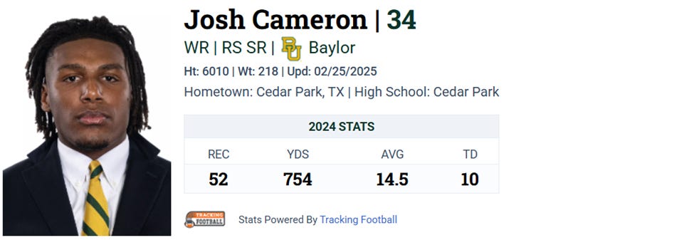Camreron lead the team leading in receiving during the 2024 season. His 161 fantasy points is a reflection of inconsistent touchdown production. That inconsistency was due in large part to the quarterback position at the start of the season. Cameron scored less than 10 fantasy points in three of the first four games, then Sawyer Robertson took over the starting quarterback job in late September. He and Cameron built a connection with each other and Cameron scored 18+ fantasy points in five of the last nine games of the season. Robertson is back for 2025, and so is starting running back Bryson Washington. Cameron is a strong Schedule Pairing option that I mentioned five times. While I think Baylor’s passing Strength Of Schedule is a little weak for Big XII teams, its still good enough to make this list. They received a B- grade for season long and the first month, and a B for the fantasy playoffs.