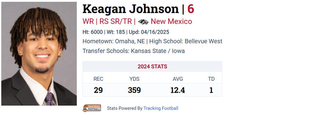 Johnson was highlighted as a Flyer option for 2025. The new Lobos offense features a CFF Coaching System that ranks #14 for POWR3 receivers and #19 for Target Magnet wide receivers. The supporting cast around Johnson is either limited, inexperienced, or both. It’s a good thing that Johnson is the most talented player in the offense since he will likely have to carry the offense on his back this season. Johnson doesn’t have much Schedule Pairing value as he was only mentioned one time. There’s a good chance New Mexico will be playing from behind this year, and their passing Strength Of Schedule gives them a chance to hang in there as they received a B- grade for season long, first month, and the playoffs.