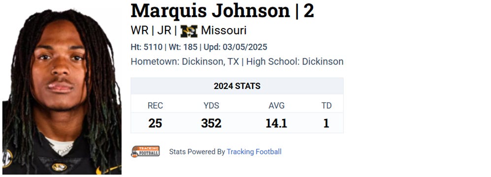 Johnson was selected as a Flyer option for 2025. While the likely WR2 behind Mississippi State transfer Kevin Coleman, he’ll benefit from playing in the #25 CFF Coaching System for POWR3 receivers. Transfer running back Ahmad Hardy brings balance to the offense, one which features a CFF Coaching System that ranks #14 for Workhorse running backs. Beau Pribula is another transfer and looks to have the lead in the quarterback position battle. Johnson also is a strong Schedule Pairing option, being mentioned six times. Missouri’s passing Strength Of Schedule fades as the season goes on though. They received a grade of a B+ for the first month, B for season long, and a B – for the playoffs.