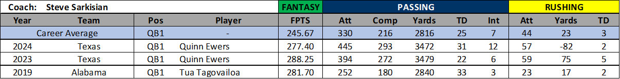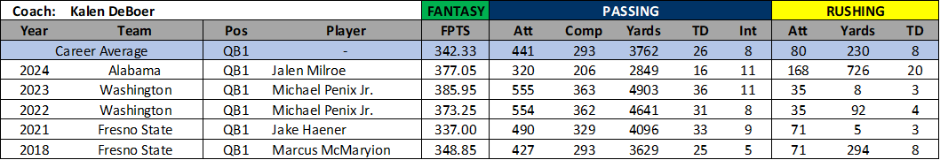Simpson spent his first three years at Alabama watching from the sidelines. With only 16 games of mop-up duty under his belt, he entered spring camp fighting for the starting quarterback job. Throughout the spring Simpson consistently ran reps with the first team offense, and he started the “spring game” as the #1 quarterback. It appears that the QB1 job is Simpson’s entering fall camp. The quarterback position in head coach Kalen DeBoer’s offense has been a strong fantasy asset. Since 2018 DeBoer’s QB1 averages 342 fantasy points per season. The offense will shift away from the run focused play calling of 2024 and into a more traditional play calling approach for DeBoer’s system. This will benefit Simpson’s fantasy outlook in 2025 as its likely he should see 425+ pass attempts.