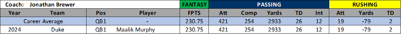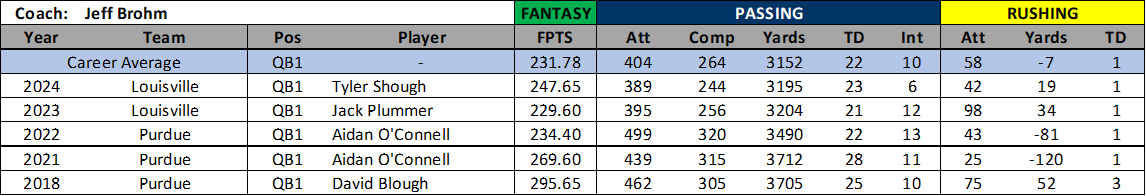 Moss spent the 2024 season playing at USC. He began the year as the starting quarterback but was benched in his nineth game of the season. Moss scored 25+ fantasy points in only 33% of his starts. His play was plagued by interceptions as he averaged two or more INTs in 66% of his starts. Moss saw the writing on the wall after being benched and transferred to Louisville. He spent the entire spring camp as the first team signal caller and looks to be a better fit inside head coach Jeff Brohm’s offense. Brohm is known as a passing coach but going back to 2018 none of his quarterbacks have scored 300 fantasy points. This offense will definitely help Moss raise his fantasy performance from the 188 fantasy points he scored last year.