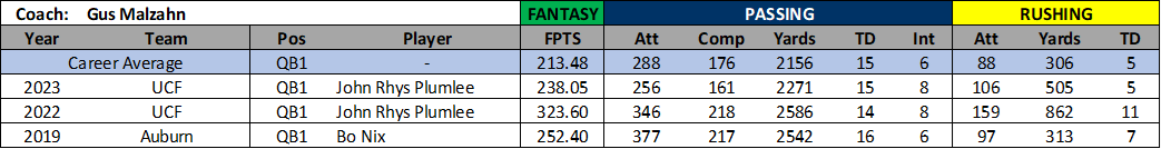 In two years at Indiana the best statistical performance that Jackson had in the air was 914 yards, 2 touchdowns and 5 interceptions. Former head coach Scott Frost was hired back to UCF and that helped convince Jackson that UCF could be a place where he could play. He had a good spring, and while not being named the starter he outshined all other quarterbacks in spring camp. From 2018-2021 Adrian Martinez was a fantasy worthy quarterback while playing within Frost’s offensive scheme. His best season was 2021 where Martinez scored 309 fantasy points. 300 fantasy points might be too high of a bar for Jackson to reach in 2025 but his talents fit this system well.