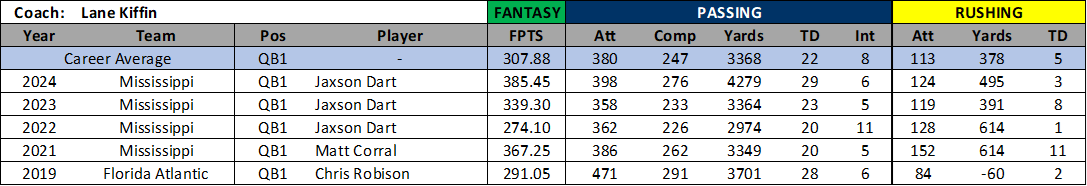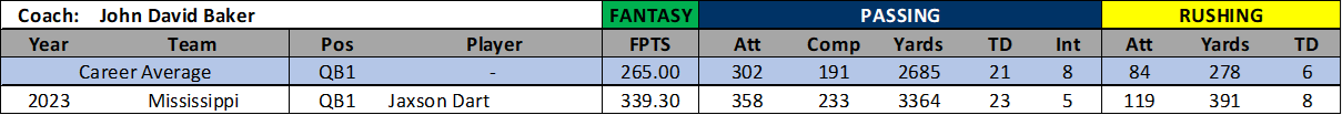 When Simmons signed with Mississippi out of high school he knew that he would be groomed to become the eventual successor to Jaxson Dart. Last season Simmons saw action in nine games but only had 32 pass attempts and 5 carries. From the start of spring camp Simmons was treated as the QB1 despite the fact the coaches did not make an official announcement on the starting job. As spring practice played out it was apparent that Simmons is the man to run the offense in 2025. There’s a chance that Simmons comes up short of 300 fantasy points just as Jaxson Dart did in his first season as a starter. But Simmons has more talent across the offense to support him, giving him a chance that he could exceed that 300 fantasy point mark.