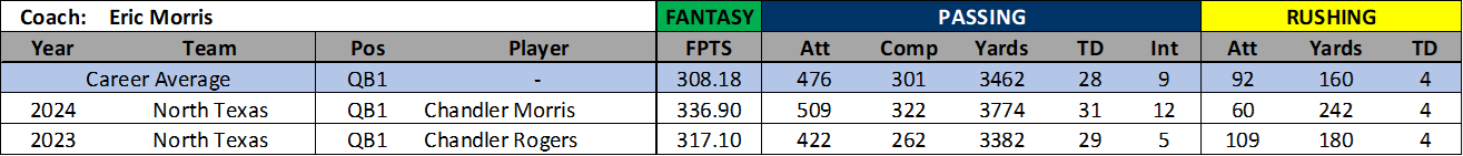 To call Poffenbarger a “journeyman” would be an understatement. He spent one year at Old Dominion, two years at Albany, and one year at Miami, Florida before making his way to North Texas this winter. Drew Mestemaker started the team’s bowl game and both came into spring camp battling for the starting job. Both have split reps with the #1 offense but it has been Poffenbarger that would come out first with the #1 offense in all the scrimmages. Fantasy owners know that you should target the QB1 for head coach Eric Morris as they’ve averaged 327 fantasy points over the last two seasons.