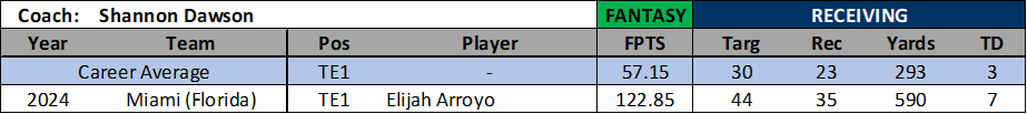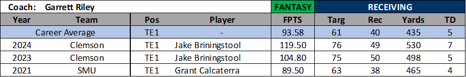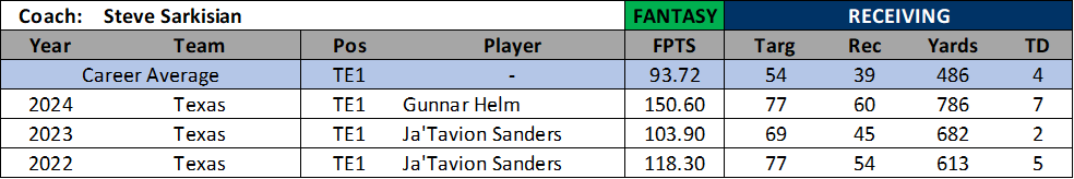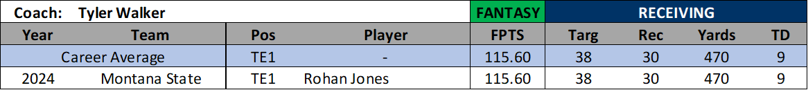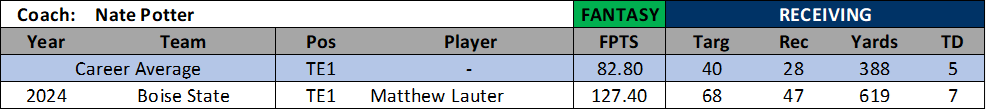 After three lackluster seasons as a back-up for Boise State, Matthew Lauter had a coming out party in 2024. After receiving just 15 targets in his first three seasons, he had 68 targets for 47 receptions, 619 yards and 7 TDs in 2024. Those numbers should go up this season as the talent of the receivers has gone down for 2025. This will force the coaches to have to lean on Lauter more in the passing game. Lauter might have the safest floor of any top fantasy tight end this year.