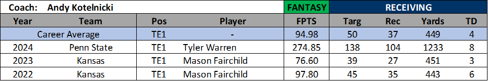 What I find interesting about Rocky Beers is that his talent level should equate to statistical production within an offense, but that is exactly what he has been missing through three different college programs. Fantasy analysts saw how great Dallin Holker was used in offensive coordinator Matt Mumme’s offense in 2023. Mumme also had another star tight end in 2021, and the hopes are that Rocky Beers is the next name to join the list below.
