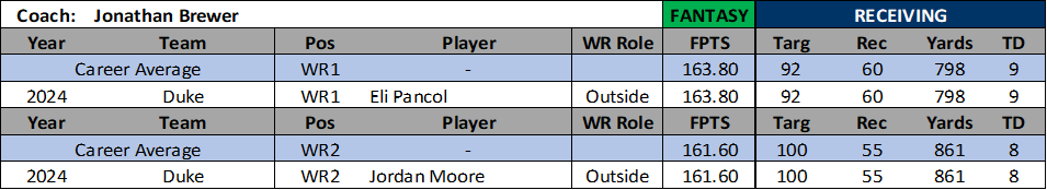 Que’Sean Brown has gradually been gaining playing time over his two years at Duke. Last season he played in all 13 games with 56 targets and 41 receptions, 445 yards and 2 TDs. This spring Brown was constantly the top producer of the receiver core and looks to be a lock for the top outside receiver in the offense in 2025. Last season the production of the passing game was held in check with the inconsistent play from quarterback Maalik Murphy. The team upgraded the position this offseason by signing Darian Mensah. The numbers shown in the chart below for the top two receivers from 2024 should be below what we see out of the passing game this year.