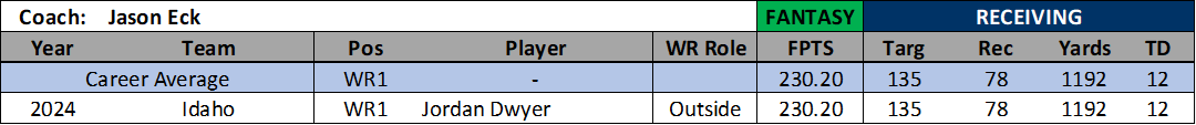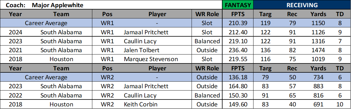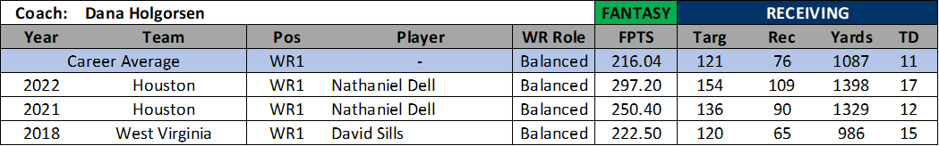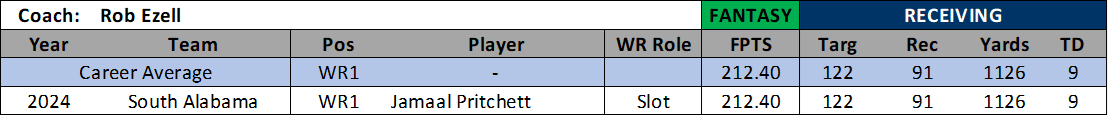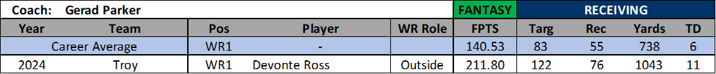 After spending two seasons as a back-up at Georgia Southern, Dallas broke into the starting line-up in 2024 and was the WR1 in the offense. This offense is known for high volume of targets for its WR1 but Dallas only received 66 targets which he turned into 46 receptions for 614 yards and 6 TDs. His fantasy performance improved in the second half of the season while first time starter at quarterback JC French’s play was getting worse. Both Dallas and French are back in 2025 and the hopes that French improves his play should translate into more fantasy success for Dallas. From 2022-2023 the WR1’s for head coach Clay Helton have averaged 166 fantasy points with a ceiling of 177 fantasy points.