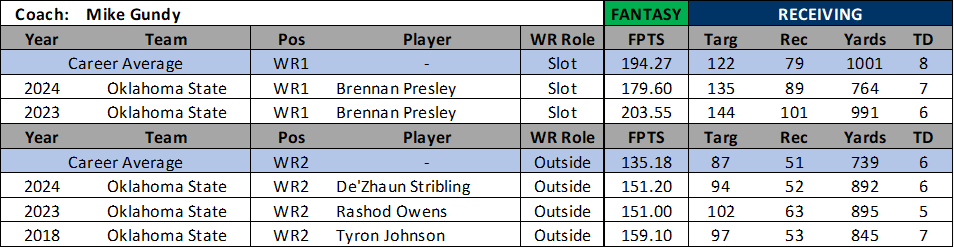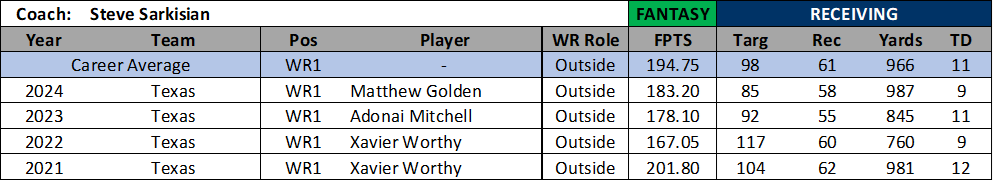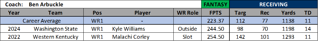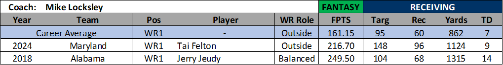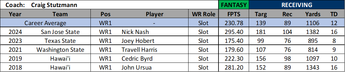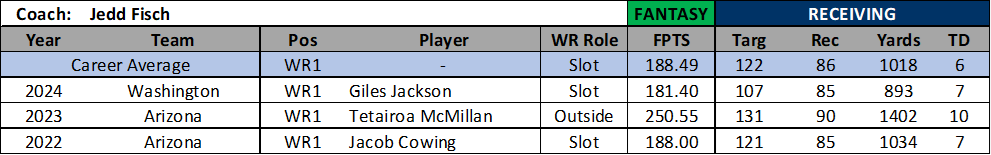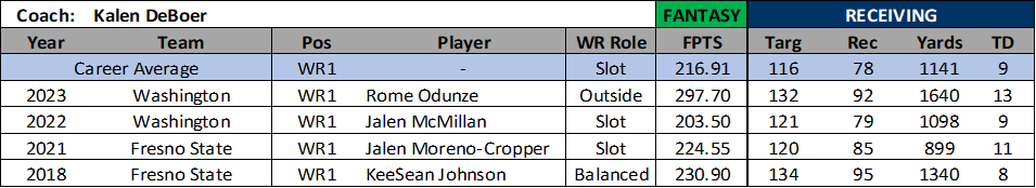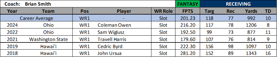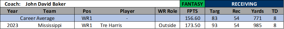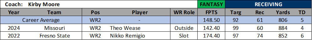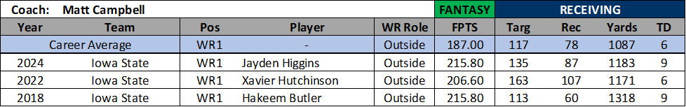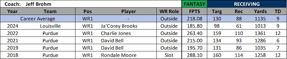 In 2024 Chris Bell started at one of the outside receiver positions in the Cardinal offense. The top outside receiver Ja’Corey Brooks has moved on and Bell is now the top dog on the outside for 2025. Bell was making plays during spring camp but had a lackluster spring game. Head coach Jeff Brohm’s history out outside WR1’s has a rich history of fantasy success that Bell should be able to tap into. Bell is not as talented as many of the names on the chart below, so it would be safe to have an expectation that Bell’s statistics should end up at the bottom of this spectrum.