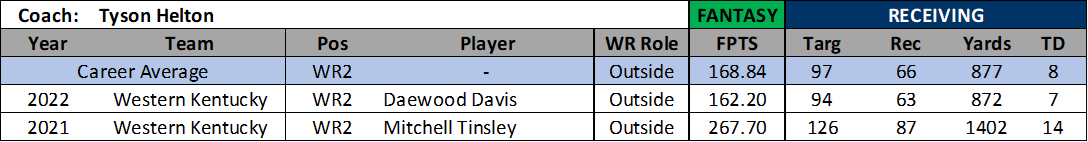 While Jameson Tucker was the leading receiver last season (and he returns for 2025), I’m looking at Graves to be the potential WR1 this year. Last year Graves saw action in 12 games and logged a minimal 38 targets for 27 receptions, 327 yards and 2 TDs. The offense struggled last year and forced a change with new offensive coordinator Drew Hollingshead being hired to right the ship. Hollingshead in two seasons at Western Kentucky feature both a slot and outside receiver as the WR1. While we don’t have a clear trend for WR role, we’ve seen the slot receiver as the more fantasy successful in this offensive system. From a talent standpoint Graves and Tucker are pretty similar. Since Tucker doesn’t hold a talent advantage and he’s an outside receiver, I’m going to place my bet on Graves in the slot.