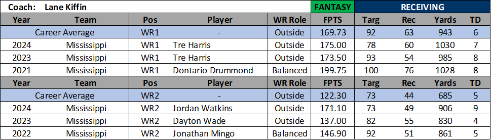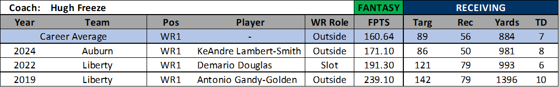 Cam Coleman was another freshman phenom wide receiver last year. While he started every game in 2024, it wasn’t until the end of the season that Coleman started to be featured in the offense. His last three games of the season saw him get targeted 26 times for 22 receptions, 306 yards and 6 TDs. Coleman enters 2025 as the locked-in WR1 and the quarterback position has been upgraded with the addition of Jackson Arnold. When you look at the 2022 & 2019 seasons from head coach Hugh Freeze’s coaching history you can see that its very possible to crack the 200 fantasy point barrier in this offense.