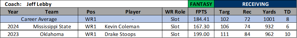 De’Zhaun Stribling has logged two seasons at Washington State and two seasons at Oklahoma State before transferring to Mississippi. In 2024 he hauled in 52 receptions for 882 yards and 6 TDs. He’s a speedy 6’2” outside receiver that has the ability take the top off the secondary. Cayden Lee has spent the last two seasons playing for Mississippi. As the WR3 last year he had 72 receptions for 874 yards and 2 TDs from the slot position. In the 2024 season opener he had 4 receptions for 78 yards and 1 TD. This was the game where this year’s new starting quarterback Austin Simmons played the most. This spring it was reported that Lee and Simmons had a great connection as Lee was targeted regularly. While a slot receiver does not have a strong fantasy history in head coach Lane Kiffin’s offense, 2025 might be a trend breaking year. The outside receiver is the role to target for historical fantasy production, making Stribling the safe bet to target in your drafts. Lee has the potential to be WR1 but a safe expectation to have would be Lee winding up in the WR2 role of the offense.