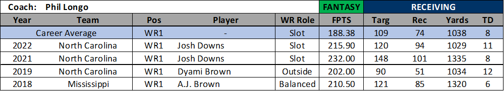 Back in 2023 Malik Phillips had 35 targets for 430 yards and 1 TD. Last season he only played in three games. What stands out to me is that Phillips is the best of the slot receivers on the roster. Even though Qua’Vez Humphreys is the most talented receiver on the roster, the slot receiver is the historical favorite to be the WR1 in head coach Phil Longo’s offense. For four years in a row (not counting 2020) Longo’s WR1 has scored 200+ fantasy points. I’m not willing to go far enough to say Phillips is a lock for 200 fantasy points but I like to potential he brings as a late round Flyer.