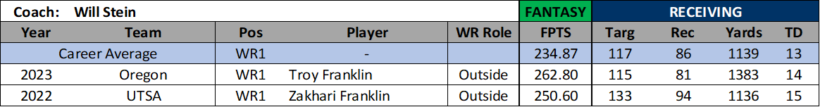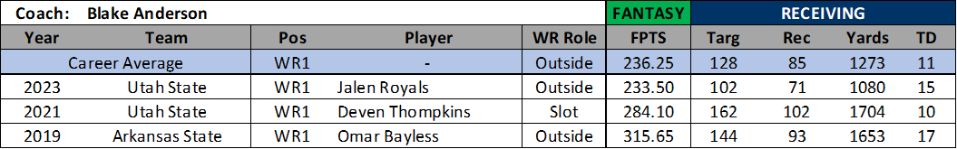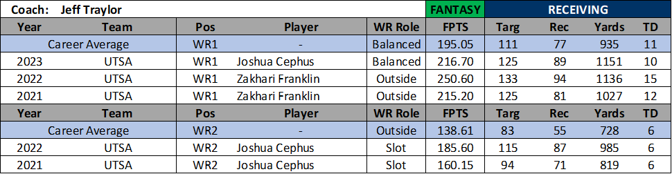 For the last two seasons Devin McCuin has been a mid-range fantasy receiver at UTSA. 2024 was expected to be a breakout season, but injury cut his season down to eight games. He only scored 15+ fantasy points in three of those eight games. Toward the end of the season David Amador (technically a Flyer) came on, racking up 36 targets for 31 receptions, 370 yards and 1 TD over the last four games of the year. Amador plays in the slot and McCuin plays a balanced role in the offense. When you look at head coach Jeff Traylor’s history you see that the best WR1 performances tend to lean toward outside receivers, and WR2 tends to lean toward slot receivers. While Amador was the hot hand at the end of the season, history shows that WR2 may be the primary role for him in the offense. McCuin has a chance at being the WR1 since a balanced receiver has been WR1 more than any other role (just not as productive as outside WRs). We’ll have to wait and see news about De'Corian Clark’s health from fall camp to see if he becomes a contender that McCuin has to deal with for becoming the WR1.