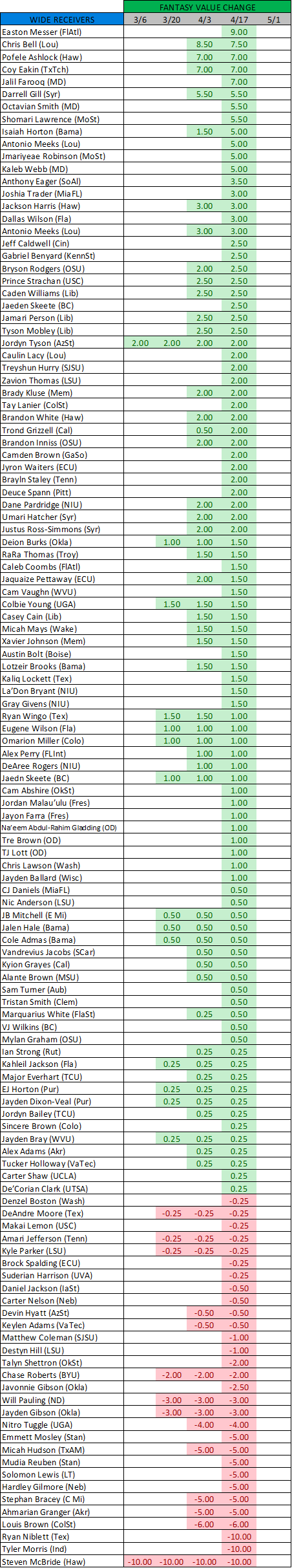 WR Chris Lawson (Wash) +1.00: Lawson (early enrollee freshman) has been making plays in the early part of spring camp as he tries to compete for the starting slot WR position.