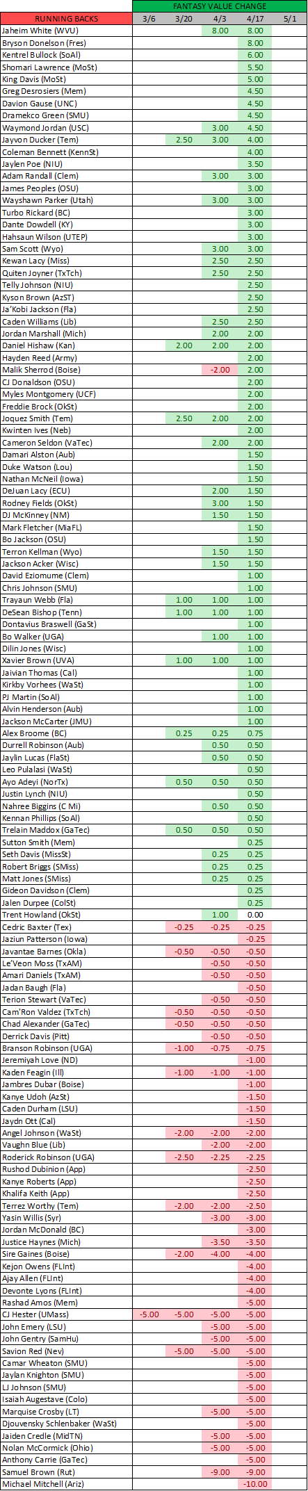 RB Jadan Baugh (Fla) -0.50: Baugh had 11 carries for 56 yards and no TDs in the spring game.