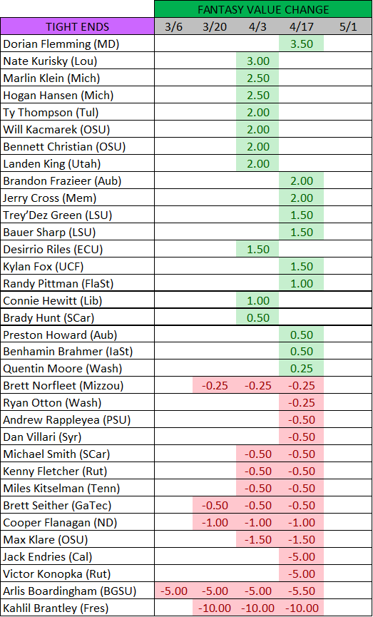 TE Andrew Rappleyea (PSU) -0.50: Rappleyea (lower body) is still being held out of practice for spring camp.