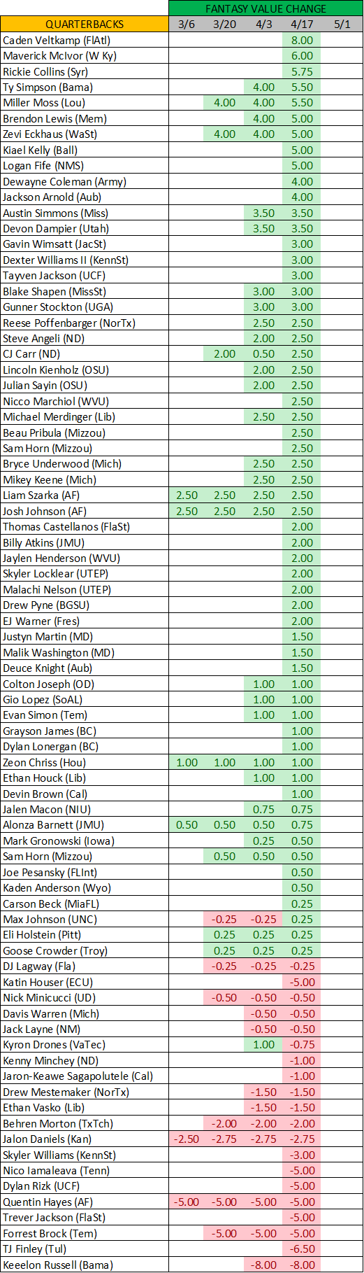 QB Caden Veltkamp (FlAtl) +8.00: Veltkamp shined in the spring game going 12/26 for 163 yards and 2 TDs.