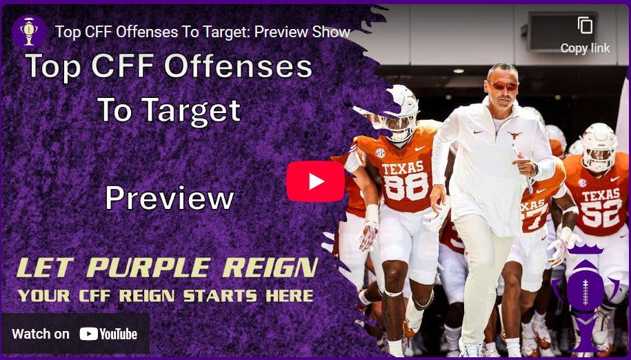 Joe Arpasi & Kevin from the The Devy Royale continue their way through the remainder of the Top CFF Offenses To Target in your CFF drafts below.